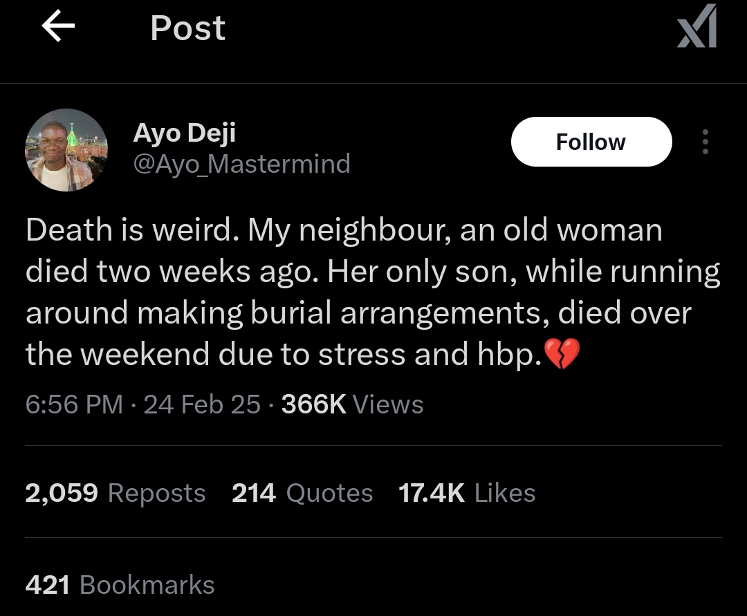 “Death is weird. My neighbour, an old woman, died two weeks ago. Her only son, while running around making burial arrangements, passed away over the weekend due to stress and HBP. 💔”