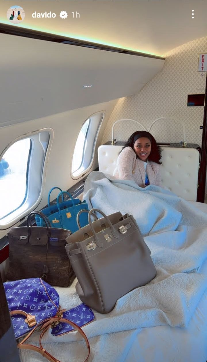 Taking to his Instagram story, Davido shared a photo of Chioma posing with her handbags in his private jet.